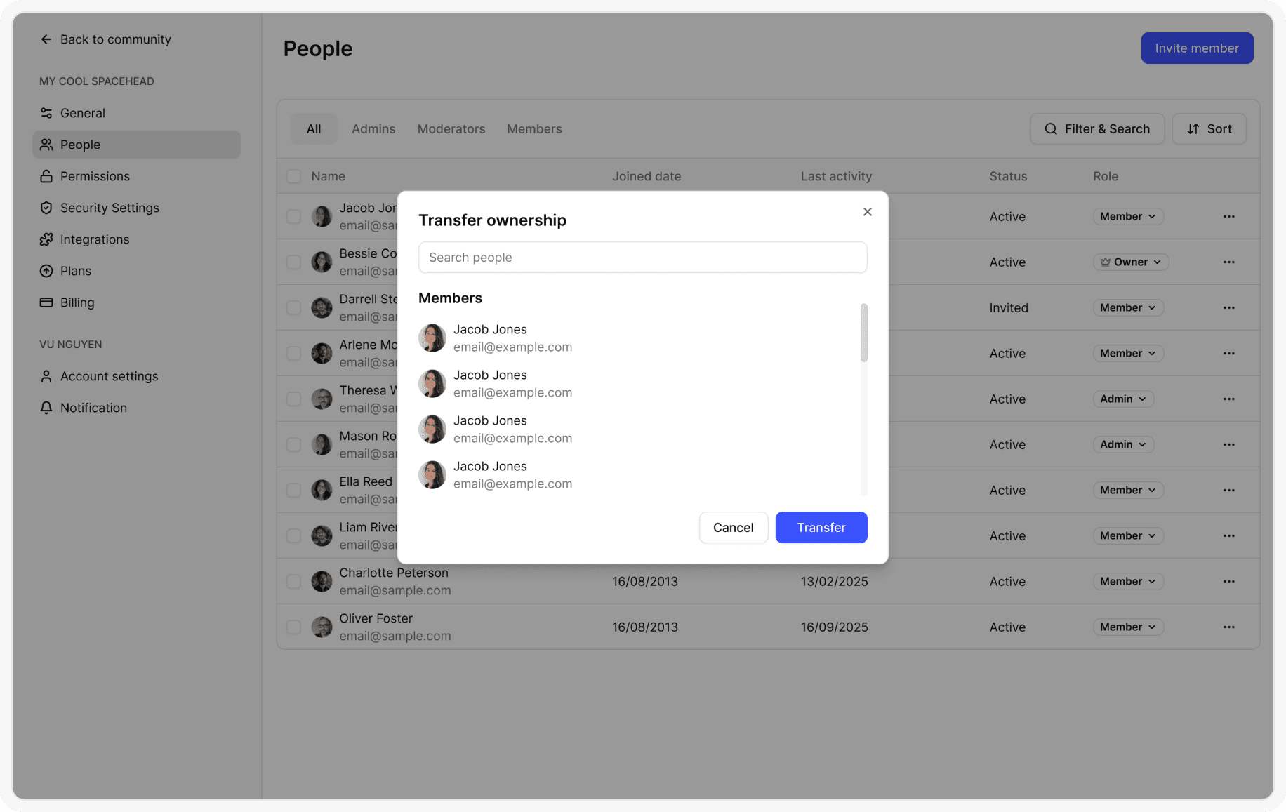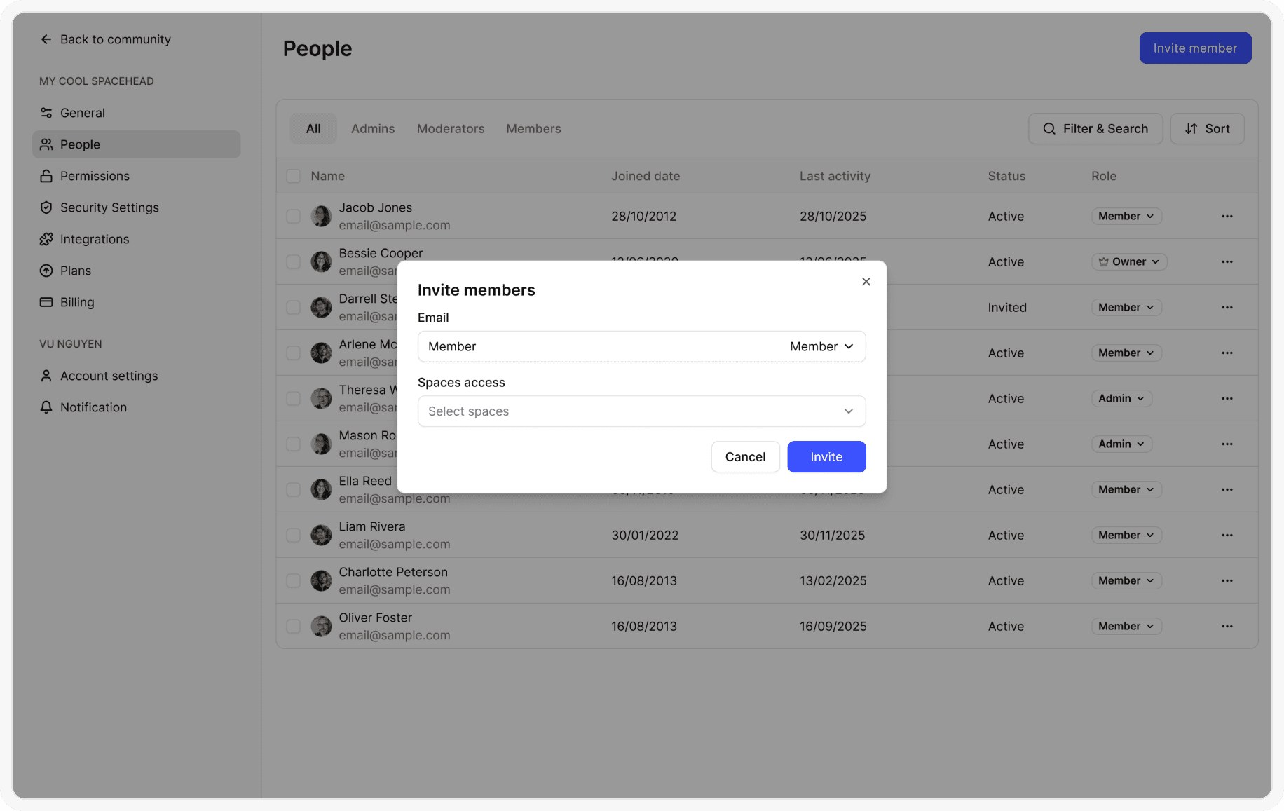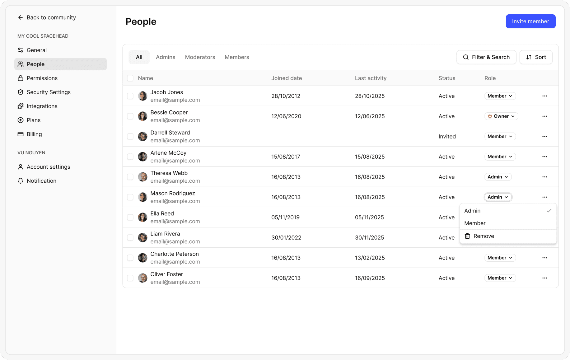 Admins and moderators can effectively manage members of your community space by adding, removing, or granting them moderation privileges.