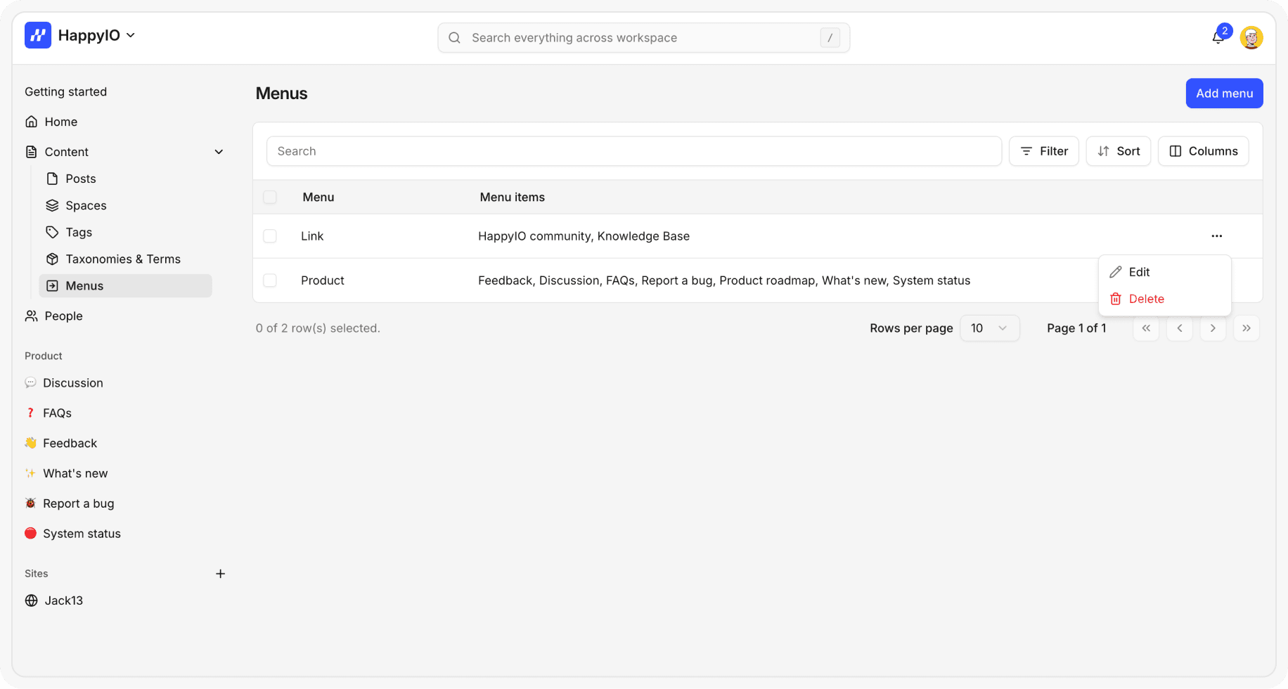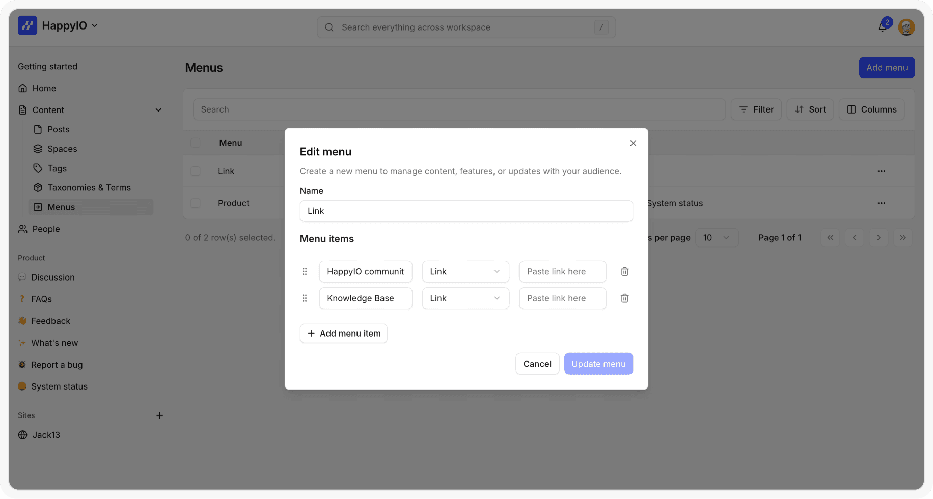 From your HappyIO workspace or public site, go to Content > Menus