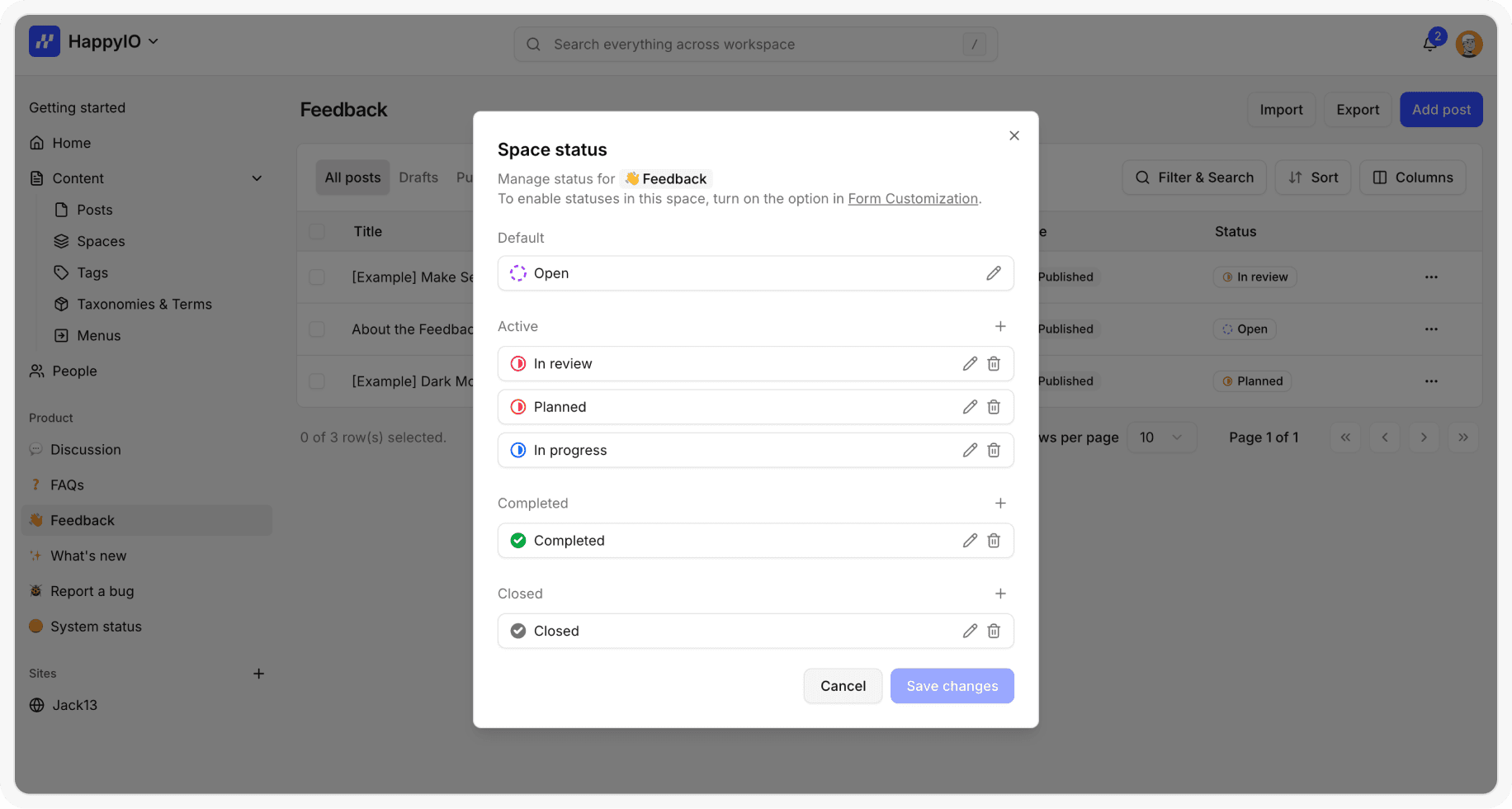 Statuses show the progress or current state of a post in your community. They help your team communicate what’s happening with a feature request, roadmap item, release, or incident.