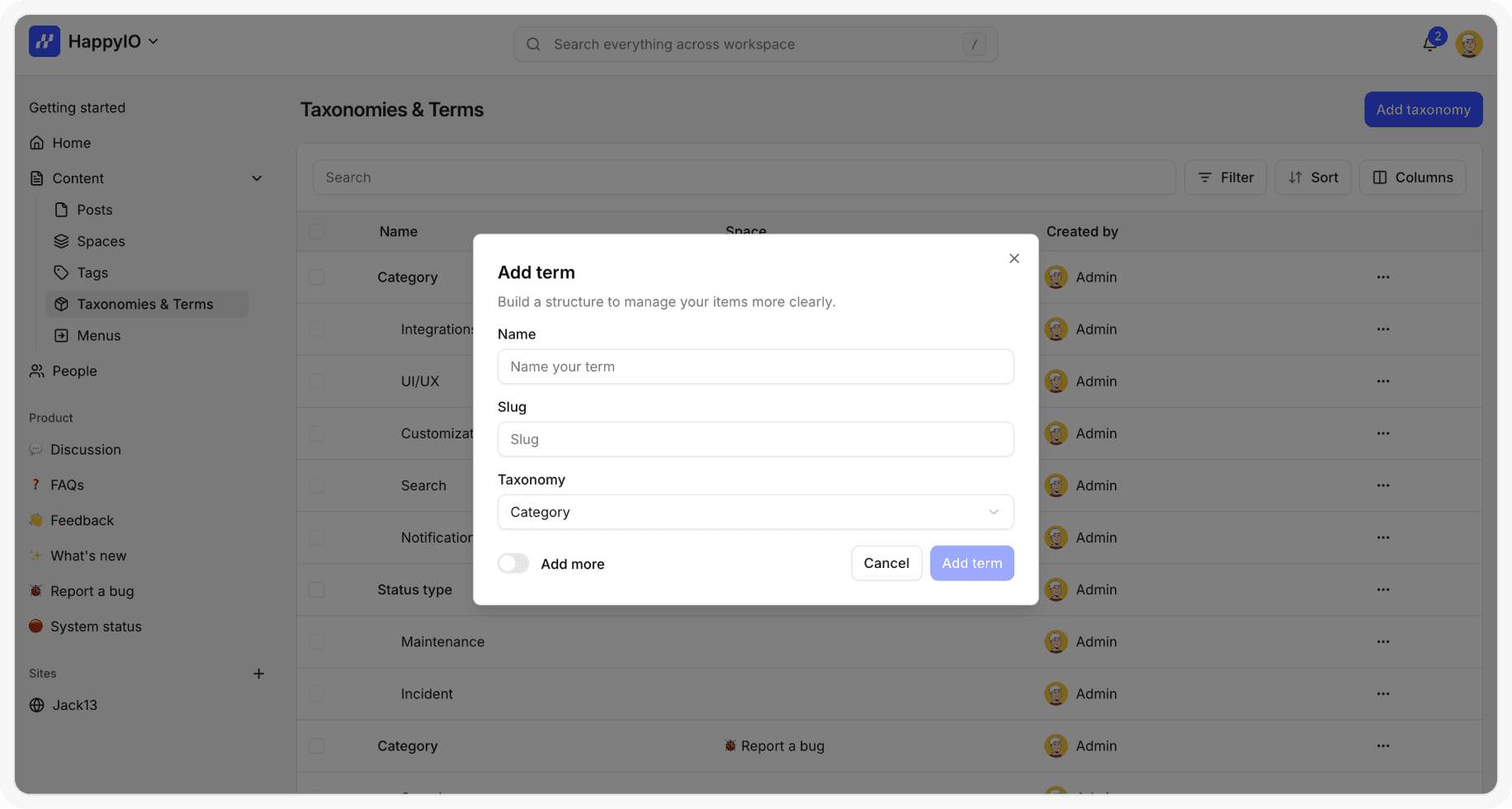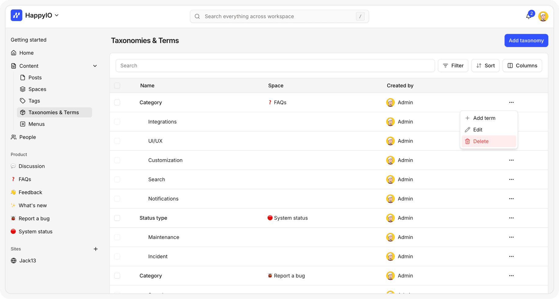 From your HappyIO workspace, go to Content > Taxonomy