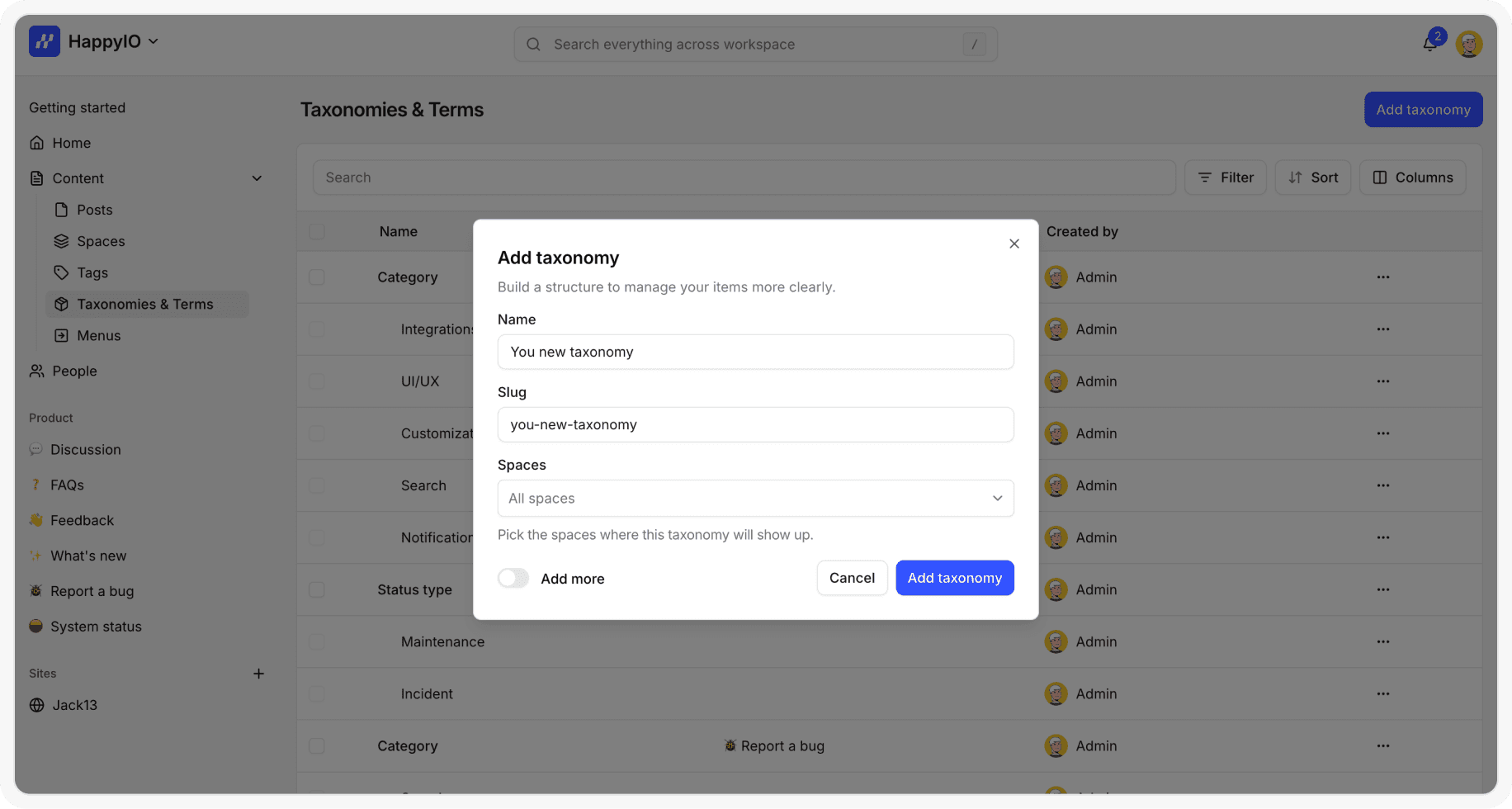 Enter a name for your taxonomy and select any spaces that you want to add