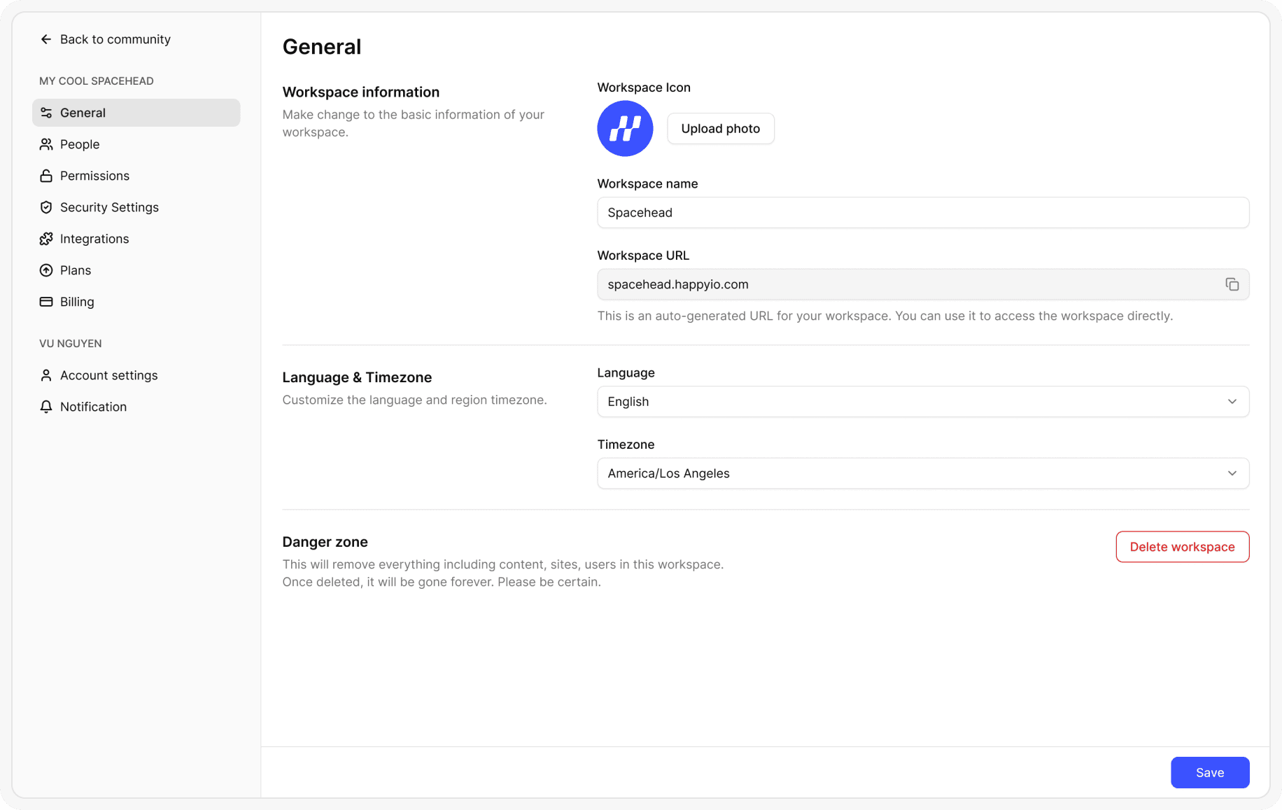 From the General page, upload a photo to change the Workspace Icon or edit the Workspace Name