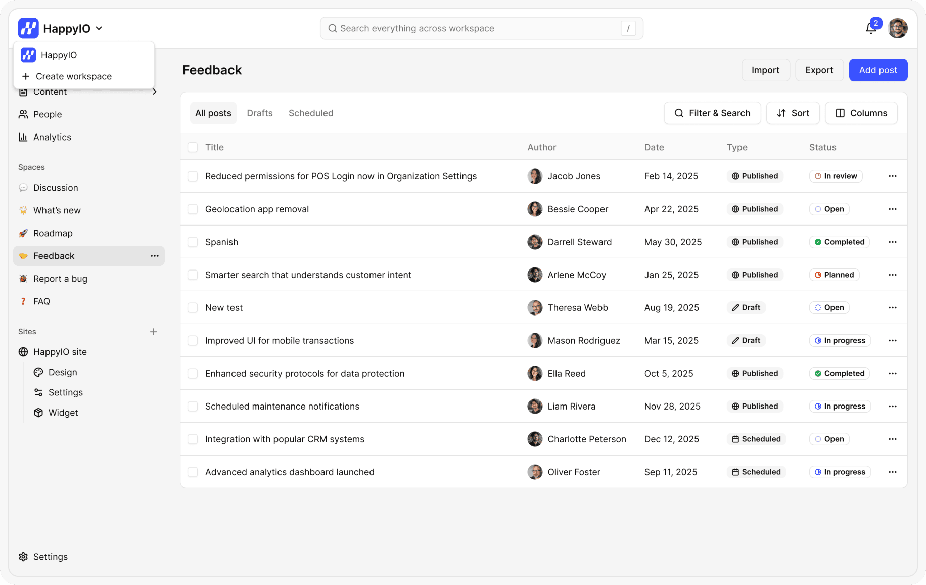 Only Workspace Owner and Staff Members (Admins and Moderators) can access the HappyIO Workspace, but end-user Members and Guests can't.